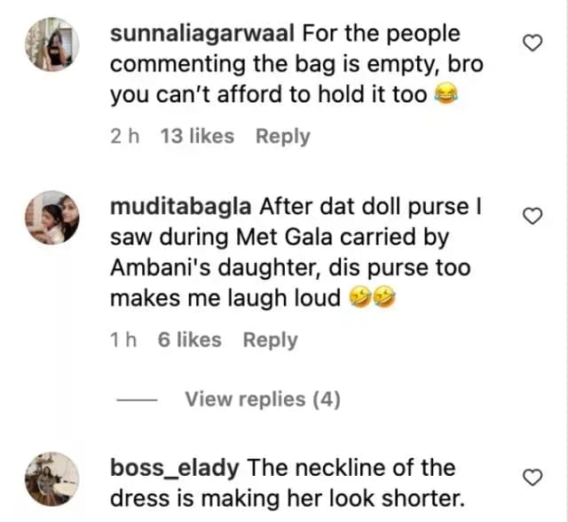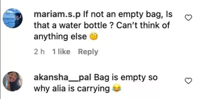 Alia looked stunning in a mini black bodycon dress for the event. She carried a small transparent handbag with this dress, which caught the attention of the netizens. While Alia's fans were all praised for her look, a section of netizens started pulling up the actress for carrying an empty bag. "That purse is empty," wrote one user. "Not an empty bag, so is it a water bottle? Can't think of anything else," commented another. See screenshots of comments here.