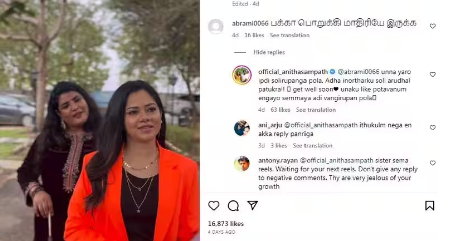 While the bigg boss show was going on in a frenzy, she got into a fight with the bigg boss season 4 title winner Aary and was evicted from the bigg boss house after the show was broadcast on Anita sampath Vijay TV. She danced with Shariq on the show and bagged the title. bigg boss Anita, who is now an actress, recently acted in Deiva Machan as Vimal's younger sister. However, apart from this, she is giving full attention to a few serials and her YouTube channel. At that time, she made it a habit to conduct reels and photo shoots on her instagram page and publish their photos. In that way, the reel that Anita sampath made with one of her friends is now in controversy. When Anita sampath posted a very normal reel, a netizen made her look ugly by commenting, "She looks like a bad rugged lady". She said that the person who liked this must have been beaten somewhere.
