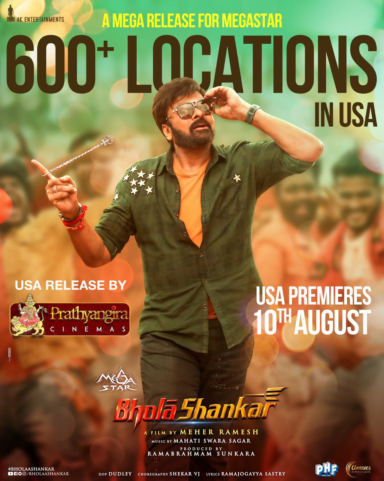 మూవీ లో మిల్కీ బ్యూటీ తమన్నా ... చిరంజీవి సరసన హీరోయిన్ గా నటిస్తూ ఉండగా ... కీర్తి సురేష్ , సుశాంత్మూవీ లో కీలక పాత్రలలో కనిపించబోతున్నారు. మహతీ స్వర సాగర్ ఈ మూవీ కి సంగీతం అందిస్తున్నాడు. ఇది ఇలా ఉంటే ఈ మూవీ ని ఈ సంవత్సరం ఆగస్టు 11 వ తేదీన థియేటర్ లలో విడుదల చేయనున్నారు. ఇప్పటికే ఇందుకు సంబంధించిన అధికారిక ప్రకటన కూడా వెలువబడింది. ఇది ఇలా ఉంటే ఈ మూవీ యొక్క "యూఎస్ఏ" హక్కులను "ప్రత్యంగిరా సినిమాస్" సంస్థ దక్కించుకుంది. అందులో భాగంగా ఈ సినిమాను ఆగస్టు 10 వ తేదీన "యుఎస్ఏ" లో ప్రీమియర్స్ వేయనున్నారు. అలాగే ఈ సినిమాను "యూఎస్ఏ" లో 600 ప్లస్ లొకేషన్ లలో విడుదల చేయనున్నట్లు కూడా ఈ మూవీ బృందం తాజాగా అధికారికంగా ప్రకటించింది. ఇలా ఈ సినిమాను "యూఎస్ఏ" లో భారీ ఎత్తున విడుదల చేయబోతున్నట్లు తెలుస్తోంది. వాల్టర్ వీరయ్య మూవీ తో బ్లాక్ బస్టర్ విజయాన్ని సొంతం చేసుకున్న చిరంజీవి "భోళా శంకర్" మూవీ తో ఏ రేంజ్ విజయాన్ని అందుకుంటాడో చూడాలి.