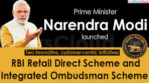 PM narendra modi Friday, launches two groundbreaking schemes the Retail Direct scheme and Integrated Ombudsman Scheme through RBI.