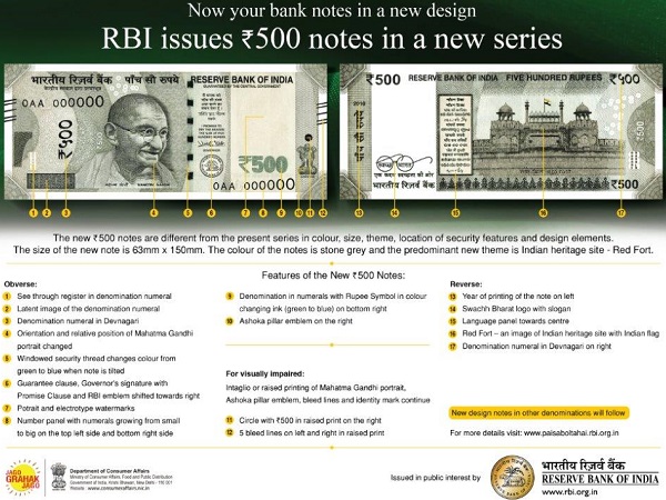 * Right side circle box with 500 written on it, 5 bleed lines on the right and left side, and emblem of Ashoka Pillar, mahatma Gandhi's picture which is ruffly printed.