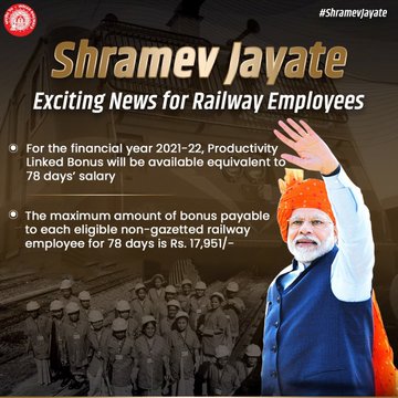 Before Diwali, the central government has given a big gift for the railway employees. The government on saturday announced a bonus equal to 78 days' salary to railway employees. It will be paid to the employees before the dussehra holidays. However, RPF and RPSF personnel will not get its benefit.