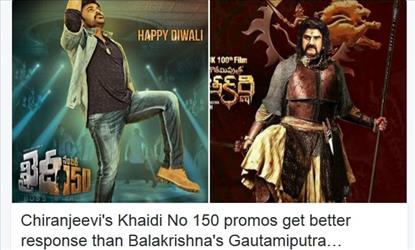 Chiranjeevi's 'Khaidi No 150' has got more views and likes than any promo video of 'Gautamiputra Satakarani' on YouTube. In fact, in round one, Chiranjeevi's 'Khaidi No 150' has completely dominated Balayya's 'Gautamiputra Satakarani'.