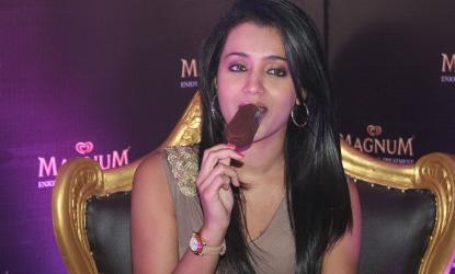 The name of Trisha’s ice cream is called Magnum and dressed in a chocolate color outfit, Trisha also looked tempting like an ice cream. She has also got few Tamil films in her bag but Tollywood has not been giving her the preference like before. But then, she has got one film ‘RUM’ in Telugu being produced by M S Raju so it looks like things are going smooth for this Chennai girl.