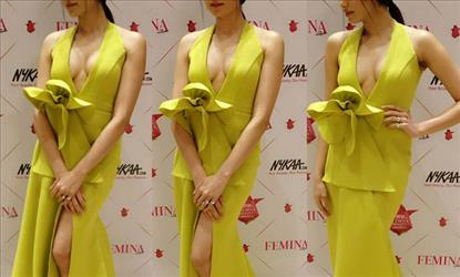 She was spotted with a long lemon yellow gown and she flaunted her cleavage flawlessly before shutterbugs. She revealed more than what she expected and this is the first time she made such a bold appearance.