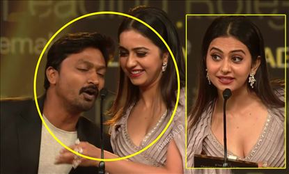Rakul Preet who came to the Dias to give the award had few words on the stage and the host poked his head in between and tried to attract her. However, Rakul smiled and eased the situation. You can take a look at the photos below,