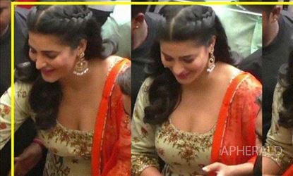 shruti Haasan who came to a shop opening ceremony was dressed in a chudi. However, the low—neck grabbed attention among the Paparazzi and when they tried to take photos from an above view, she herself took a cue and covered it to avoid embarrassment.