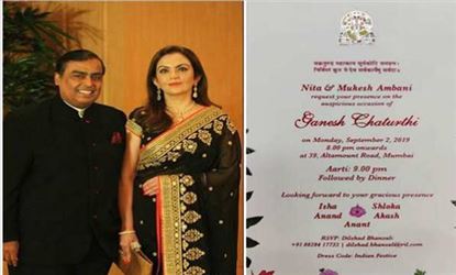 आपको बता दें कि देश के सबसे बड़े बिजनेसमैन अंबानी खानदान भी इस त्यौहार को बड़े धूमधाम से मनाते हैं। अब गणेश उत्सव में केवल 5 दिन शेष बचे हैं। ऐसे में भला अंबानी परिवार में उत्सव न हो ऐसा ही नहीं सकता। इसी बीच खबर आ रही हैं। गणेश चतुर्थी उत्सव की तैयारियों में अंबानी परिवार भी लग गया हैं। खबरों की मानें तो गणेश चतुर्थी के लिए नीता अंबानी और मुकेश अंबानी ने अपनी बहू और बेटी-दामाद को इस उत्सव में शामिल होने का न्यौता भेज दिया है। सोशल मीडिया पर अंबानी परिवार का इनविटेशन कार्ड वायरल हो रहा हैं। इस कार्ड को स्पॉट ब्वॉय वेबसाइट ने सोशल मीडिया एक आमंत्रण कार्ड की तस्वीर साझा की है।