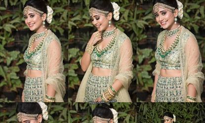 उन्होंने अपने लुक को ग्रीन और गोल्डन बैंगल्स, हाथफूल, दो हैवी नेकलेस, मैचिंग ईयररिंग्स, नथ और माथापट्टी से एक्सेसराइज किया है। यहां वे बिल्कुल दुल्हन की तरह सजी हैं। उन्होंने आईशैडो से अपनी आंखों को हाईलाइट किया है। इस दौरान शिवांगी ने अपने बालों को बन में बांधा है और फूलों से सजाया है।