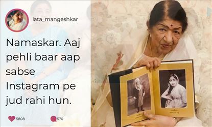 लता मंगेश्कर ने दो फोटोज शेयर की है। अपनी पहली फोटो में लता मंगेश्कर एक किताब को पकड़े नजर आ रही हैं। पहली फोटो के साथ लता मंगेश्कर ने लिखा, " नमस्कार। आज पहली बार सबसे इंस्टाग्राम पर जुड़ रही हूं।