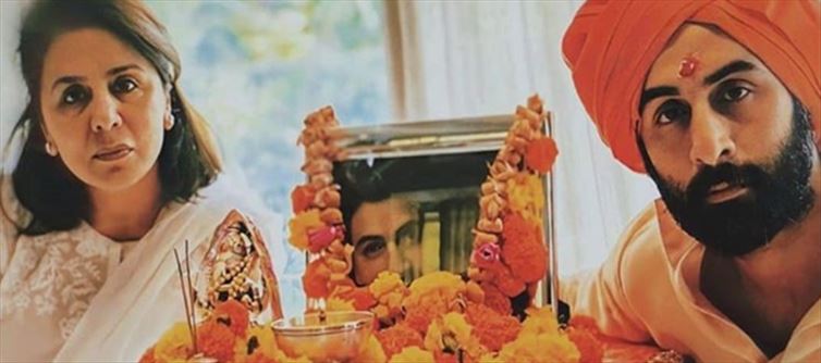 फोटो में रणबीर को पगड़ी और कुर्ता दान करते हुए दिखाया गया है, जबकि दिवंगत अभिनेता की पत्नी नीतू कपूर सफेद सूट पहनती हैं।