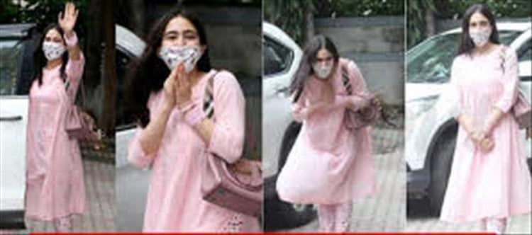 Actress ali KHAN' target='_blank' title='sara ali khan-Latest Updates, Photos, Videos are a click away, CLICK NOW'>sara ali khan stepped out of her residence and visited filmmaker Aanand L Rai's office in Andheri. The actor-filmmaker duo is collaborating for Atrangi are, which happens to be Rai's next film as a director after zero that came out in 2018. ali KHAN' target='_blank' title='sara ali khan-Latest Updates, Photos, Videos are a click away, CLICK NOW'>sara ali khan was wearing an elegant pink Kurta Pajama and of course, she didn't forget to wear her mask. In her signature style, she waved to the paparazzi and despite the mask hiding half of her face, she could be seen smiling. There's another signature style of the actress and that's her humble and polite Namaste. She greeted the paparazzi with folded hands as she always does.