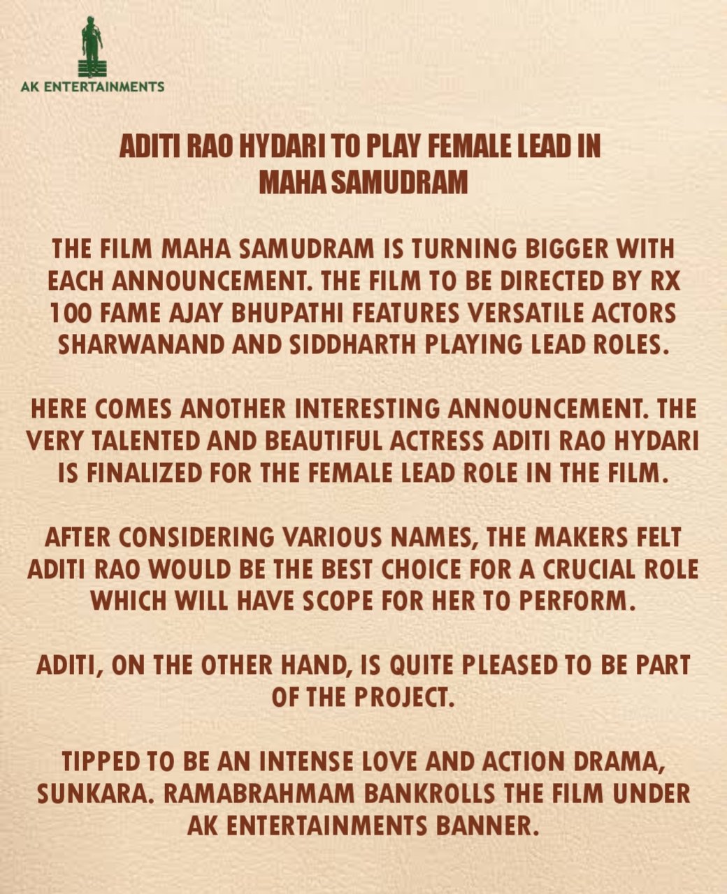 హీరోయిన్ గా అదితిరావ్ హైదరీని ఎంపిక చేసింది టీమ్. ఈమేరకు అఫిషియల్ కన్ఫర్మేషన్ ఇచ్చింది టీమ్. ఇంపార్టెంట్ క్యారెక్టర్ కు అదితిని ఎంపిక చేశాం. కథలో ఆమెది కీలకమైన పాత్ర అంటూ అదితి గురించి చెప్పుకొచ్చింది టీమ్.