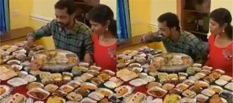 ఆ వంటకాలు అన్నీ సర్దడానికే డైనింగ్ టేబుల్ మొత్తం సరిపోయింది. ఆ 125 రకాల్లోనూ అన్ని టేస్ట్లు ఉండేలా చూసుకున్నారు. స్వీట్, హాట్, పండ్లు, బర్గర్లు, రకరకాల కూరలు, రకరకాల రైస్లు అన్నీ వరుసగా అల్లుడి ముందు పెట్టారు.వెజ్, నాన్ వెజ్ అన్నీ పెట్టారు. అవన్నీ ఒక్కొక్కటి టేస్ట్ చేసినా కూడా కడుపు నిండిపోయేంతగా ఉన్నాయి. ప్రస్తుతం దీనికి సంబంధించిన వీడియో వైరల్గా మారింది.తనకు అన్ని రకాల ఫుడ్ పెట్టిన అత్తింటి వారి ప్రేమకు ఆ అల్లుడు ఫిదా అయినట్టు ఉన్నాడు. తన భార్యకు కూడా కొంచెం టేస్ట్ చేయమంటూ స్పూన్తో అందించాడు. కానీ, నాకొద్దు అంటూ ఆమె తినలేదు. ఈ వీడియో పశ్చిమ గోదావరి జిల్లా భీమవరంలో జరిగినట్టు తెలిసింది.