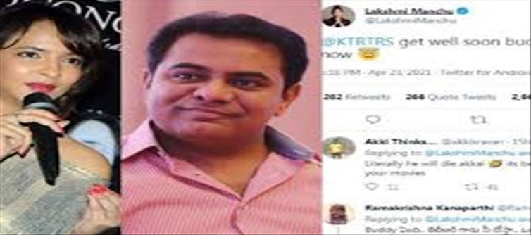 అయితే కేటీఆర్ త్వరగా కోలుకోవాలని చాలామంది ప్రముఖులు ట్వీట్లు చేస్తున్నారు. ఈ నేపథ్యంలోనే మంచు లక్ష్మి కూడా చాల వెరైటీ గా ట్వీట్ చేసింది.మిత్రుడు కేటీఆర్ త్వరగా కోలుకోవాలి. ఈలోపు నా సినిమాలు అన్ని చూసేయ్' అంటూ మంచు లక్ష్మీ ట్వీట్ చేసింది. దింతో ఆ ట్వీట్ కాస్త వైరల్ అయింది.. దానికి ఘాటుగా నెటిజన్లు ఇష్టమొచ్చినట్లు కామెంట్లు పెడుతున్నారు. నీ సినిమాలు చూసే కన్నా కరోనా తో చచిపోవడం బెస్ట్ అని హితవు పలుతున్నారు. కొందేరేమో ఇష్టమైన మీమ్స్ పెట్టీ ఈ ట్వీట్ ను ఇంకాస్త వైరల్ చేస్తున్నారు.. మంచు లక్ష్మీ కి ఇది నిజంగానే షాక్ అనే చెప్పాలి..