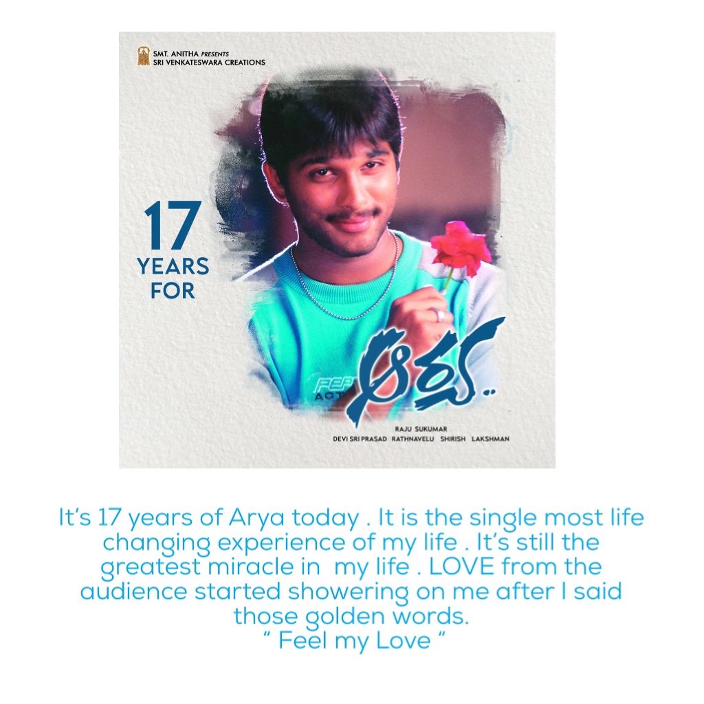 Actor allu arjun now shared a message on the 17th year anniversary. He wrote, "It's 17 years of arya today. It is the single most life-changing experience of my life. It's still the greatest miracle in my life. love from the audience started showering on me after I said those golden words. "Feel my Love". Fans of allu arjun are also trending several hashtags on social media praising the movie. Stay tuned.