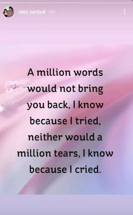 The actress now took to instagram stories and she shared a quote which reads as, "A million words would not bring you back, I know because I tried, neither would a million tears, I know because I cried,” it read. She also posted a note from one of her fan clubs, which said that they were feeling ‘low and depressed’ after reading her note, and added the hashtag #LoveYouAll."