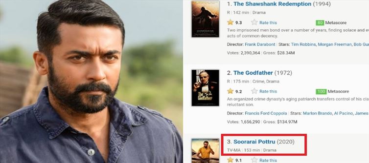 Suriya's 'Soorarai Pottru' tamil Film which was also eligible for The Oscars 2021 has bagged the third spot on IMDB's list of Top-Rated 1000 Films. The movie is just behind 'The Shawshank Redemption' and 'The Godfather' in the list. The movie has an IMDb rating of 9.1. On the other hand, The Godfather which is in second place has a score of 9.2 and The Shawshank Redemption ranks top with a score of 9.3 on the website.