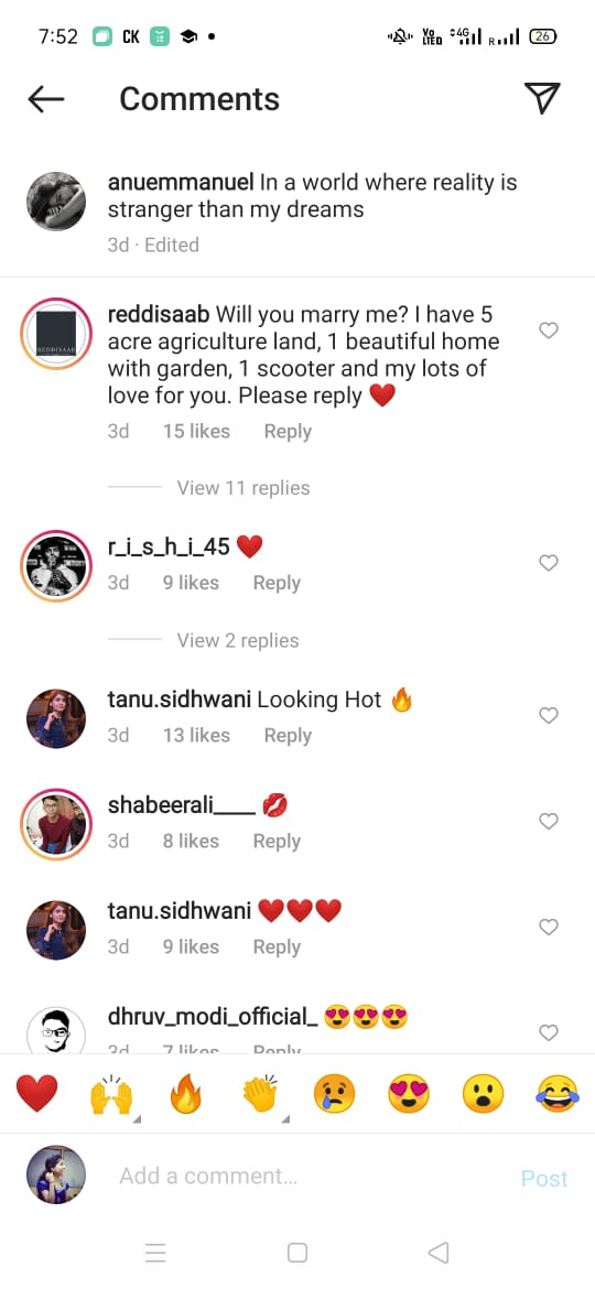 ఇక ఈ అమ్మడు సోషల్ మీడియాలో చాలా యాక్టివ్గా ఉంటుందన్న సంగతి అందరికి తెలిసిందే. ఫోటో షూట్ లతో ఎప్పటికప్పుడు అప్డేట్స్ షేర్ చేస్తుంటుంది. అయితే తాజాగా లాంగ్ వైట్ కలర్ షర్ట్ వేసుకొని ఫోటోలకు ఫోజులిచ్చింది ఈ బ్యూటీ. ఈ ఫోటోలను షేర్ చేయగా ఓ నెటిజన్ నుంచి ఊహించని విధంగా రిప్లయ్ వచ్చింది. అయితే అతడు ఏం రిప్లయ్ ఇచ్చాడు చూద్దామా. మీరు నన్ను పెళ్లిచేసుకుంటారా? నాకు ఐదు ఎకరాల పొలం ఉంది. గార్డెన్తో కూడిన ఓ అందమైన ఇళ్లు ఉంది. అలాగే ఓ స్కూటర్ కూడా ఉంది. వీటన్నింటికి మించి మీపై బోలెడంత ప్రేమ ఉంది అంటూ లవ్ ప్రపోజ్ చేశాడు. దీంతో ఈ కామెంట్స్ ఇప్పుడు సోషల్ మీడియాలో తెగ వైరల్ అవుతున్నాయి.
