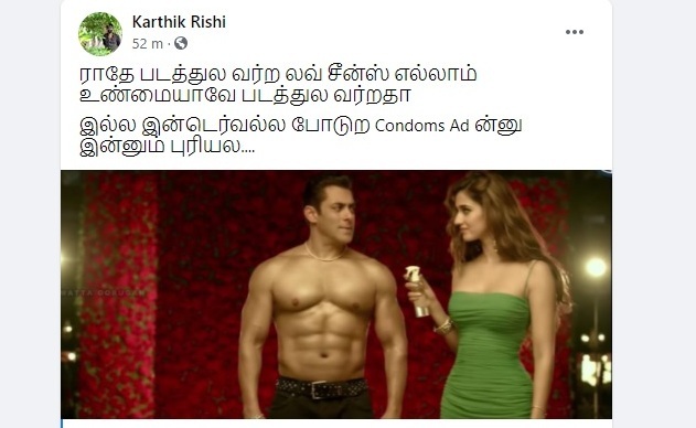 Recently, tamil fans have started to troll the movie on social media. The above image clearly says how much they are trolling it right now. The above meme says, "Is this Radhe movie or a Condom ad during an interval break?" There are several other trolls and memes on instagram pages regarding the movie. It seems 'Radhe' is a bad lesson for salman khan and Prabhu Deva!