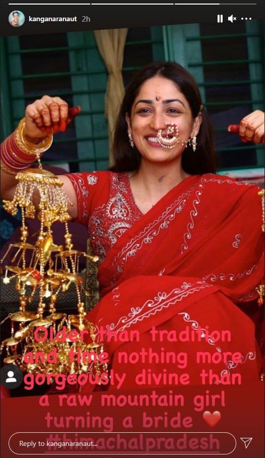 Sharing a picture of yami dressed in red as a bride, kangana wrote on her instagram Stories and praised her. She recently praised samantha for her role in the amazon series The Family Man. kangana later mentioned yami in the comment section that she looks like a divine Devi. In the photos, the attractive bride wore a red ethnic costume and flashed a smile for the camera.