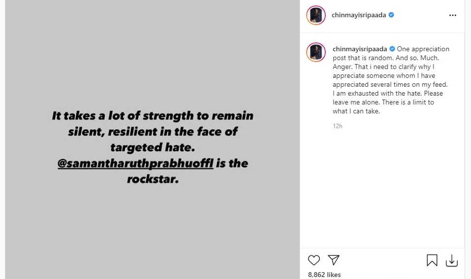 Chinmayi even blocked comments on her instagram account and the singer who is literally fed up with all those abuses finally vented her rage with a post again. chinmayi has clarified that she is exhausted with all the hate as she has praised the actress several times before and she praised her just like the same and there is nothing else on her mind.