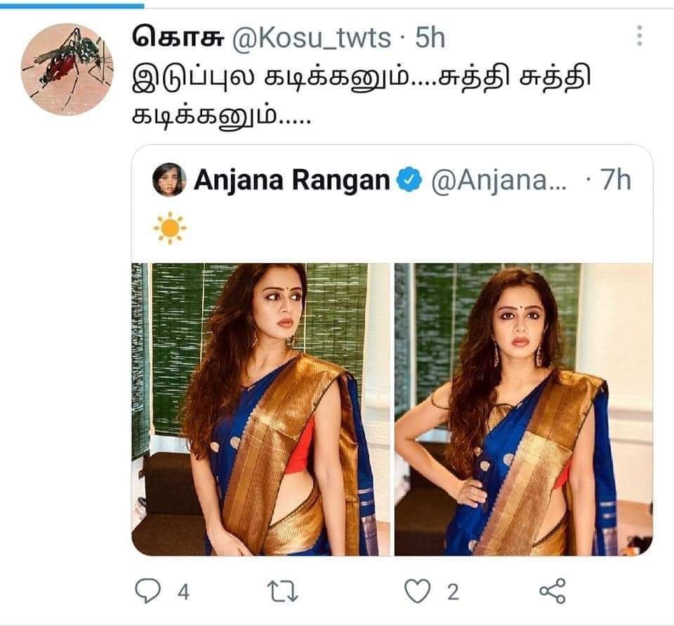 One of the Parody accounts under the name 'Mosquito' has commented on her photos that it should bite her hip and it should keep on biting it around. More than the photos, the trolls, and comments on the photos have gone viral and in fact, she got a huge response than she would have imagined for the post. This is not the first time Anjana Rangan faces such a backlash for her exposure.