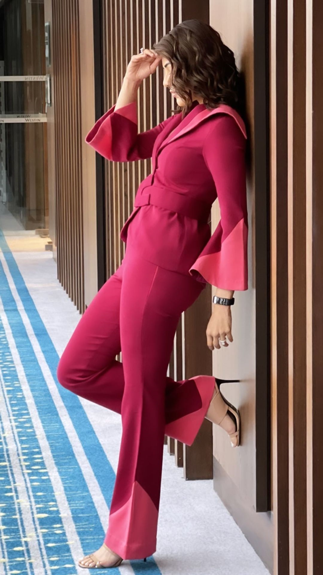 She confessed on her instagram stories that, this pink colored dress was designed by her friend who is also her baby sister Ms.Ritisha. The actress was totally ravishing and resplendent in this dark pink attire and was keeping it even more attractive with some minimal makeup stuff. She also wore matching earrings and it was absolutely phenomenal to see her in a complete package while she was dressed in absolute pinkish!