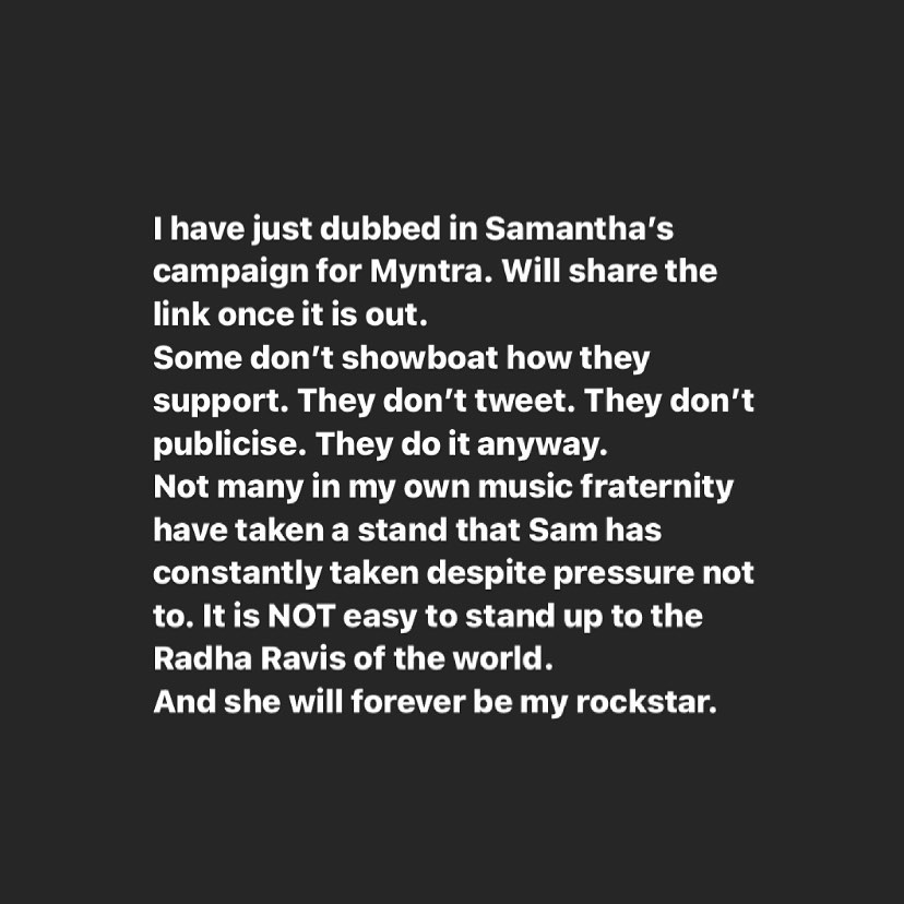 Chinmayi even revealed that even her colleagues in the music fraternity never took this bold decision to stand by her during all the tough times, but samantha took a bold decision and stood with her and that is why chinmayi returned the favor by praising her for her debut in 'Family Man 2'. chinmayi is also against Actor cum Politician ravi -Latest Updates, Photos, Videos are a click away, CLICK NOW'>radha ravi and currently, he is the president of that dubbing union. Now, chinmayi confessed she has dubbed for samantha for the Myntra ad and it will be going on air soon.