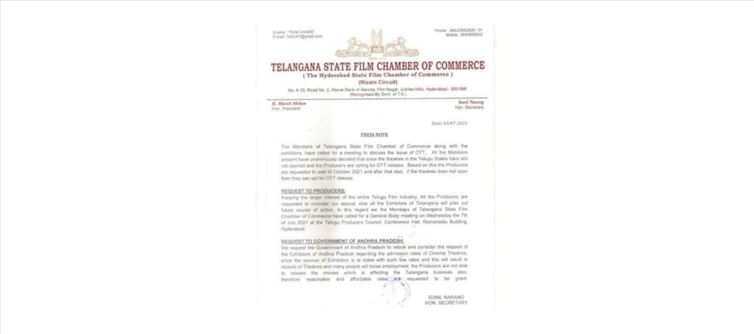 ఈ సందర్భంగా పలు కీలక అంశాలు చర్చించుకోవడం జరిగింది. అందుకే ఈ నేపథ్యంలో నిర్మాతలు అందరూ కూడా తమ సినిమాలను ఓటీటీ ప్లాట్‌ఫాంకి ఇవ్వొద్దని ఎగ్జిబిటర్లు తీర్మానించారు. కరోనా లాక్‌డౌన్‌ ఎత్తివేసిన నేపథ్యంలో... జూలై చివరినాటికి థియేటర్లు ఓపెన్ చేసుకునే అవకాశం ఉన్నందున అక్టోబర్‌ 30 వరకు ఓటీటీలకు సినిమాలు ఇవ్వొద్దని తెలపడం జరిగింది. ఇక తొందరపడి సినిమాలను అమ్ముకోవద్దని దిష్టి బ్యూటర్లు విజ్ఞప్తి చేశారు.ఇక ఈ సందర్భంగా... నిర్మాతలు తమ సినిమాలను థియేటర్లో విడుదల చేయకుండా ఓటీటీలో ప్రదర్శించడం అంటే సినీమా ఇండస్ట్రీలో ఒక ముఖ్యమైన విభాగాన్ని దెబ్బతీయడమేనని తెలంగాణ ఫిల్మ్ ఛాంబర్ అభిప్రాయపడటం జరిగింది. తమ విజ్ఞప్తిని లెక్క చేయని నిర్మాతల పట్ల భవిష్యత్తులో కఠినంగా వ్యవహరించాలని నిర్ణయించింది. ఈ క్రమంలో జూలై 7న తెలంగాణ ఫిల్మ్ ఛాంబర్ జనరల్ బాడీ సమావేశం జరపాలని నిర్ణయం తీసుకుంది. సినిమా పరిశ్రమ విస్తృత ప్రయోజనాల రీత్యా నిర్మాతలు సహకరించాలని విజ్ఞప్తి చేయడం జరిగింది.
