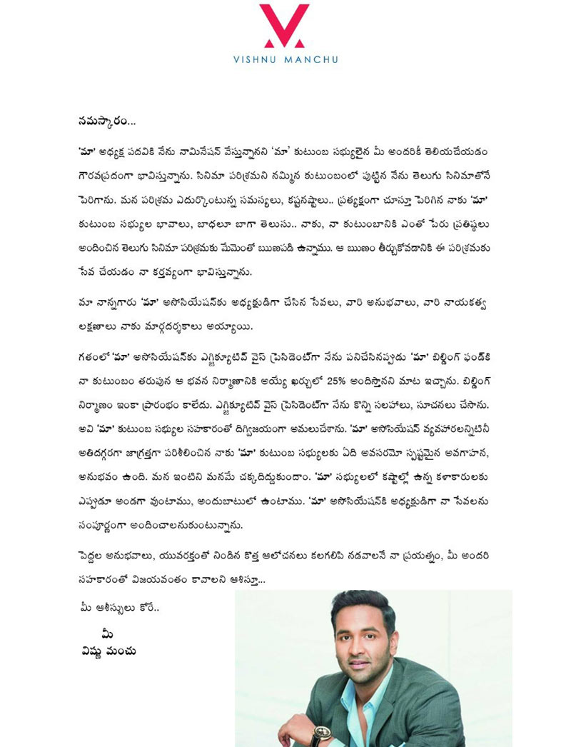 ఇప్పుడు ఎక్కడ చూసినా సినీ ఇండస్ట్రీలో ఎక్కువగా మా మూవీ ఎలక్షన్ గురించి వినిపిస్తోంది. ఆ ఎలక్షన్లకు సంబంధించి ఒక విషయాన్ని ఒక్క లెటర్ రూపంలో తెలిపాడు మంచు విష్ణు. ఆ లెటర్ విశేషాలేమిటో చూద్దాం."నేను మా మూవీ ఎన్నికల్లో పాల్గొంటున్న సంగతి అందరికీ తెలిసిందే. ఒకప్పుడు మద్రాసులో, తెలుగు, కన్నడ, మలయాళం, తమిళ నటులకు కలిపి ఒకే అసోసియేషన్ లాంటిది ఉండేది. కానీ మన తెలుగు నటుల కోసం ఒక ప్రత్యేకమైన సంఘం ఉంటే బాగుంటుందని"తెలుగు సినీ ఆర్టిస్ట్ అసోసియేషన్" ను రూపొందించారు.