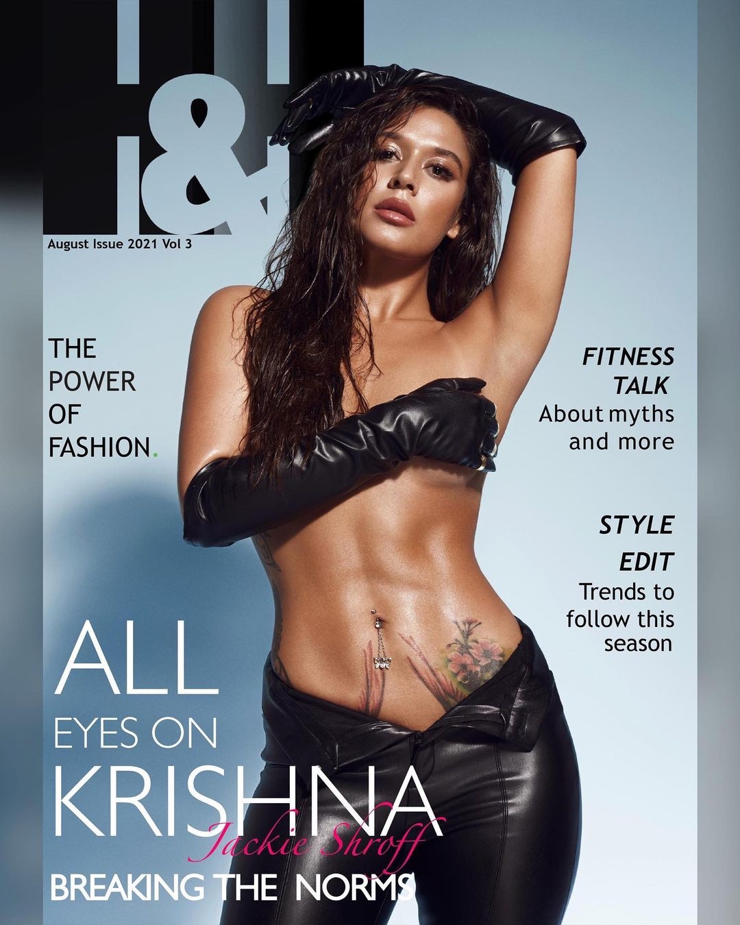 We can also notice matching black leather gloves to give the perfect oomph factor. Krishna's hairstyle was wet and she wanted to provide that perfect dewy finish on the Magazine cover. krishna Shroff currently has 907K followers on her instagram profile account and this particular photo has crossed 100,000 likes and this topless photoshoot is for HH Magazine India, august 2021 edition.