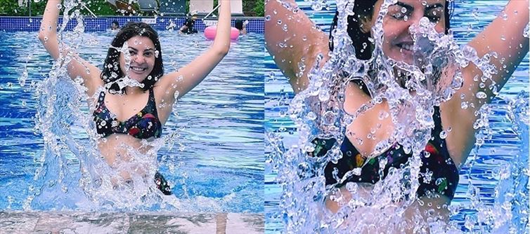Kajal Aggarwal has literally set the Internet on fire and she has flaunted her assets and tried to cover it by splashing the water and she has captioned it with a great pool day on the photos. kajal aggarwal earlier flaunted herself in a bikini during her maldives tour along with her sister nisha Aggarwal and her parents, but at that time she just sported on a single-piece bikini and already this bikini photo of Kajal has crossed more than 500k likes.