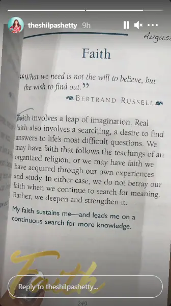 Even while her husband raj Kundra is being held in a pornography case, actress shilpa shetty has published an excerpt from a book about faith. shilpa took to instagram late monday night to share a photo of a book that featured a quotation by Bertrand Russell. "What we need is not the will to believe, but the desire to learn," it said. "Faith requires a leap of imagination," shilpa shetty said in an excerpt.