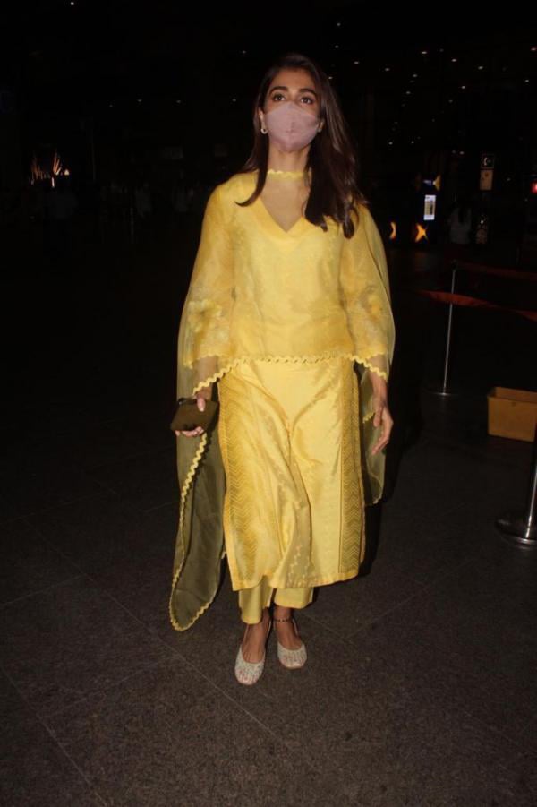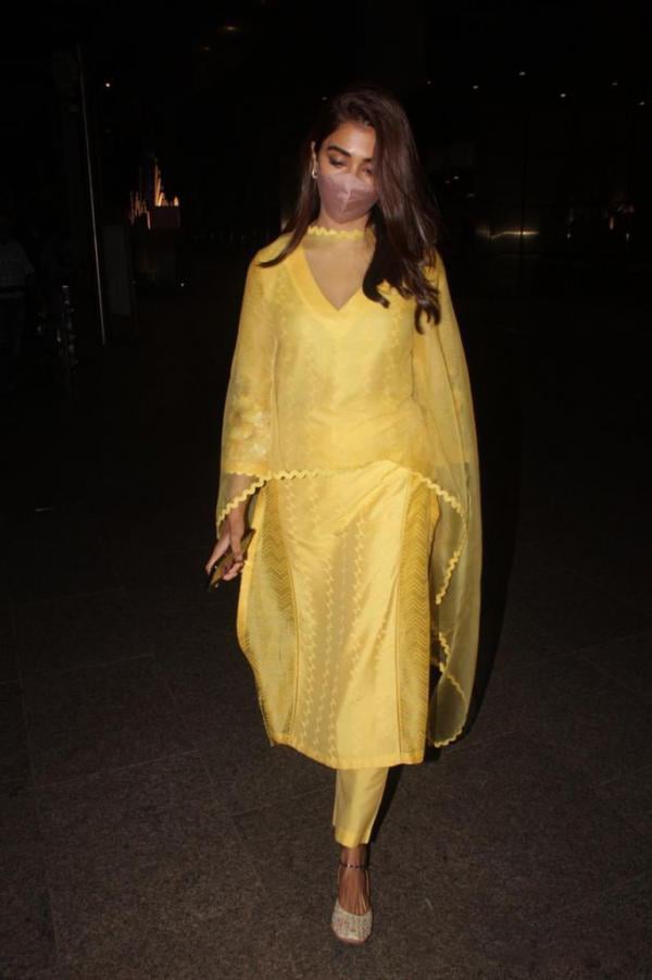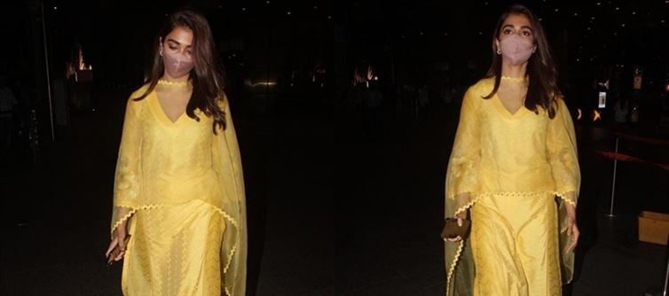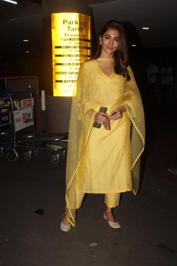 Pooja Hegde was sighted at the mumbai airport after concluding a session of Thalapathy Vijay's Beast third schedule in Chennai. She is the film's starring heroine and the actress made a fashion statement by dressing in a traditional yellow suit with a matching dupatta and juttis. pooja looks stunning, and we're all swooning over her airport ensemble.