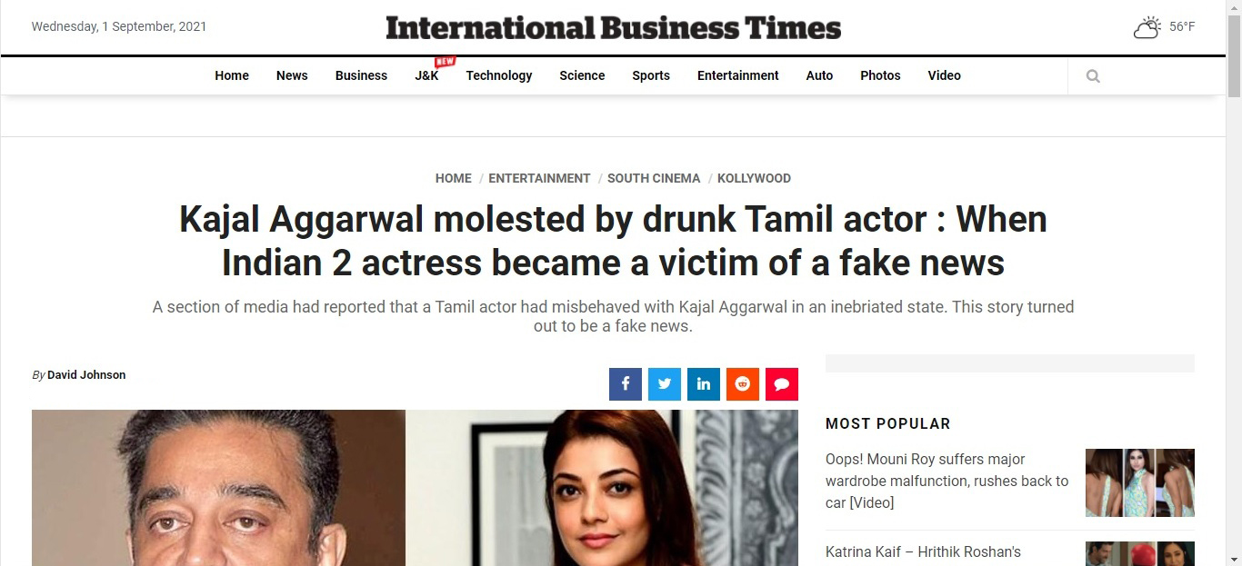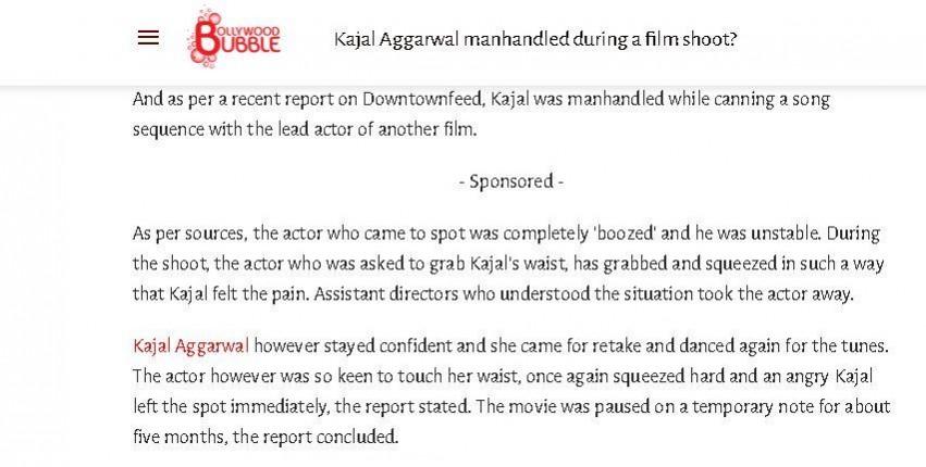Kajal Aggarwal seems to be a new victim of false news as a section of media earlier reported in bollywood that the actress was harassed by an actor who was in an inebriated state at the shooting and despite he tried to take advantage during intimate scenes, she continued without any retakes. The news was shared on BollyBubble and several YouTube gossip news channels as well and there was a huge story around that incident and after that, it got wrapped under the nets.