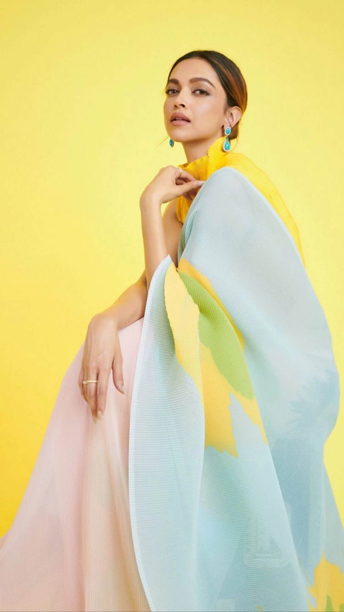 For her presentation, the actor, who was last seen in Chhapaak, wore a unique dual-toned saree by creator Payal Khandwala. A beautiful abstract poppy motif adorned the front of the pastel pink and powder blue pleated saree. She wore a bright metallic gold blouse with a high neck to complement the rayon georgette saree. With liberal applications of eyeliner and a basic matte lip hue, her make-up was kept to a bare minimum. Her hairstyle was pulled back into a low bun and she wore turquoise teardrop earrings.
