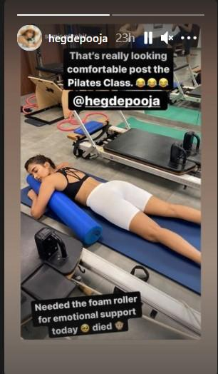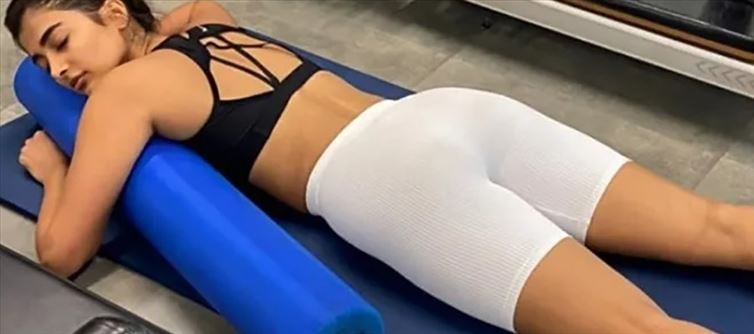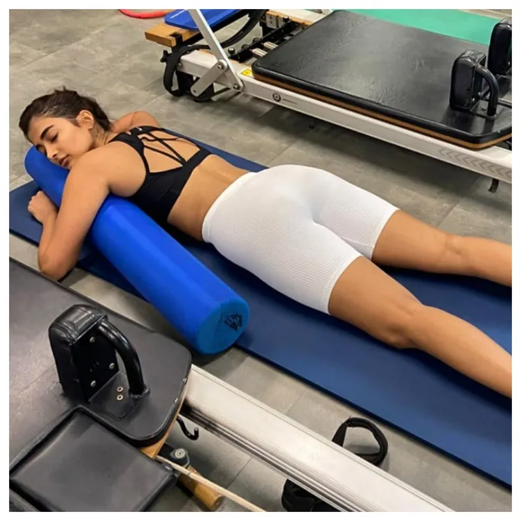 Pooja Hegde turned to social media to share a touching photo of herself after a pilates practice. We can see pooja dozing off in the gym after a hard and exhausting exercise in the photo. She clutched onto her foam roller for extra 'nice and comfortable sleep and psychological support,' according to the photo. In the middle of it all, we couldn't help but notice Pooja's toned physique, which is an absolute goal. The ala vaikunthapurramloo starlet looked stunning after her training, dressed in a black sports bra and white biker tights shorts.
