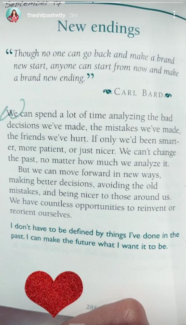 Shilpa Shetty started her saturday with a heartfelt note. She showed me a page from a booklet with a Carl Bard quotation on it. shilpa has been making news over the last week as raj Kundra's case has progressed. The entrepreneur was detained in July in connection with an allegedly pornographic film case and has been held in detention ever since. shilpa has been posting book-related postings, and on saturday, she started her day with a statement on 'fresh endings,' which she posted with her followers.