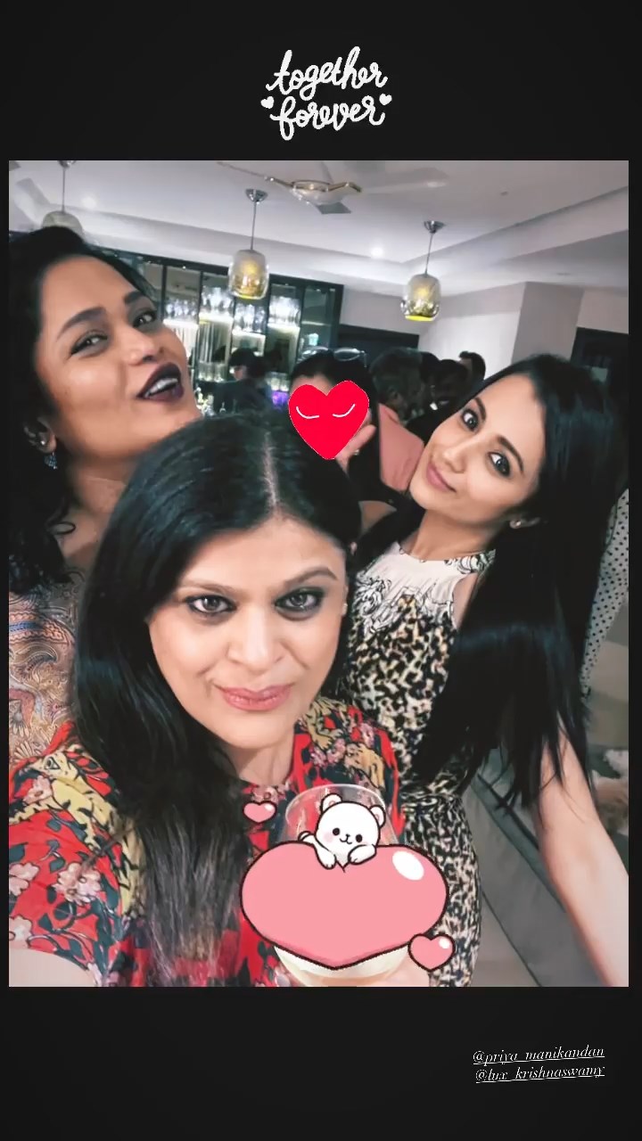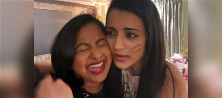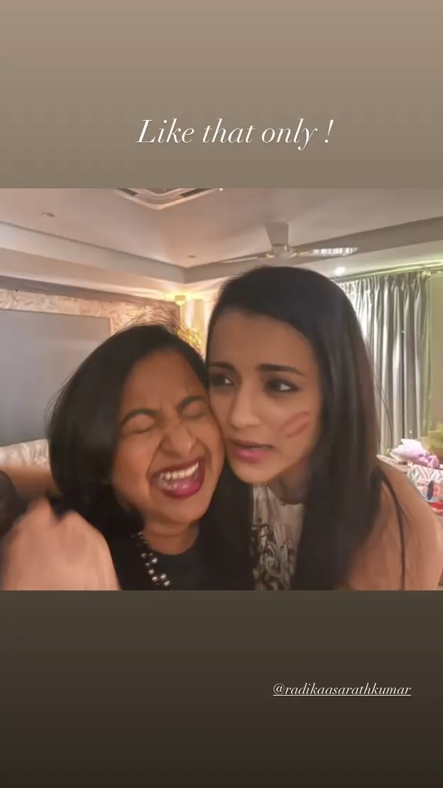 Trisha recently celebrated ramya Krishnan's birthday and after that, she threw a party for samantha along with Keerthy suresh and kalyani Priyadarshan. They were seen having some gala time together and it is obvious they had some fun moments together from the photos and Trisha's cheeks had a lip mark and we wonder who kissed trisha so deeply and passionately?