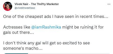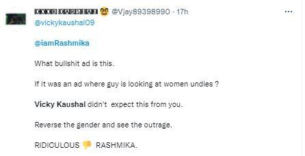 Rashmika Mandanna has been chastised on the internet for appearing in such an advertisement. 'Cheapest commercials in modern years,' said one of them. rashmika Mandanna's follower remarked on social networks, "These Cheap commercials are not anticipated from you Geetha." rashmika Mandanna's followers are furious that she appears in this commercial alongside Vicky Kaushal.