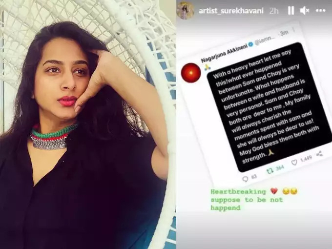 అయితే నాగార్జున పెట్టిన ఈ పోస్ట్ ను తాజాగా సురేఖవాణి కూడా ఈ పోస్ట్ పై స్పందించి ఈ యువ జంట విడిపోతుందని విషయం తెలిసి తనకు గుండె పగిలిన ఎంత పని అయింది అన్నట్లు ఎమోషనల్ అయ్యింది. ఇలా జరగకుండా ఉండాల్సింది. ఇక వీరి విషయంపై ఇప్పటికే ఎంతోమంది పలువురు ప్రముఖులు కూడా స్పందించడం జరిగింది.. వారు చేసిన కొన్ని కామెంట్స్ చాలా హాట్ టాపిక్గా మారాయి.