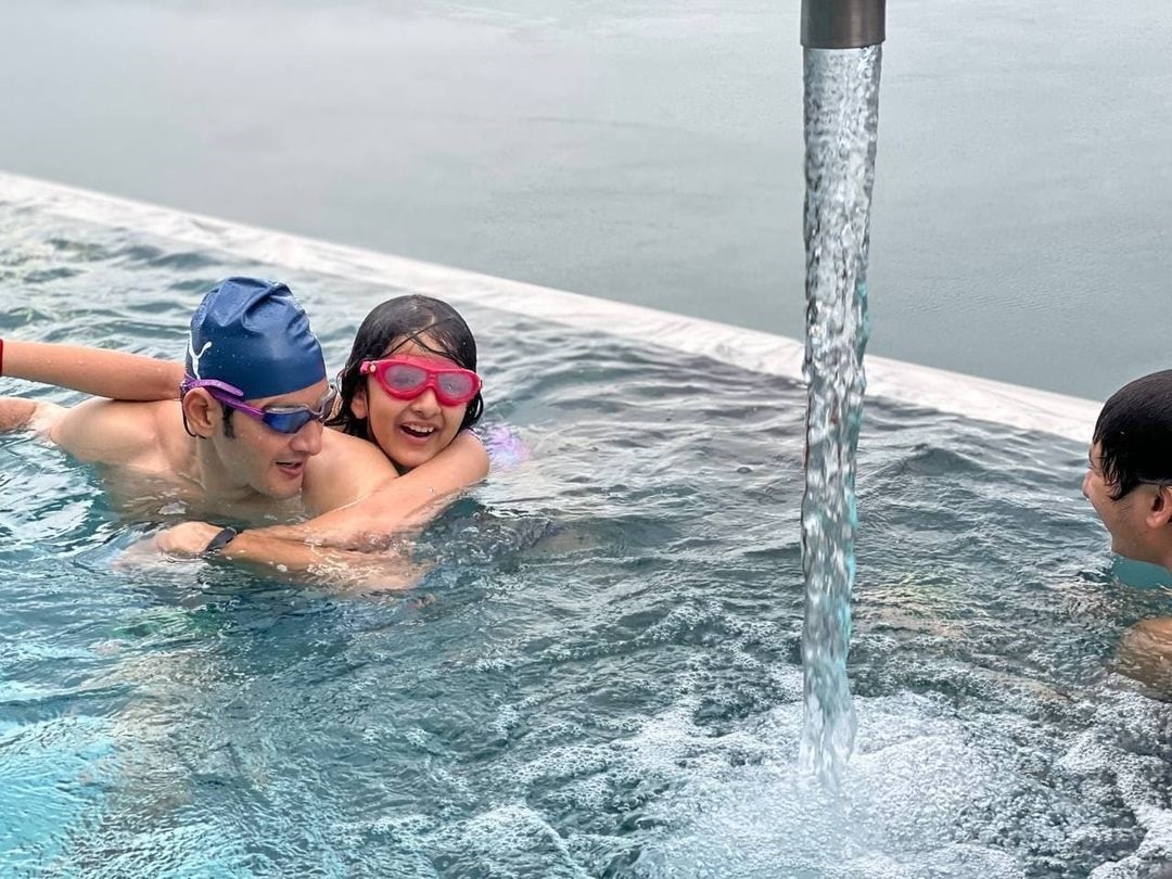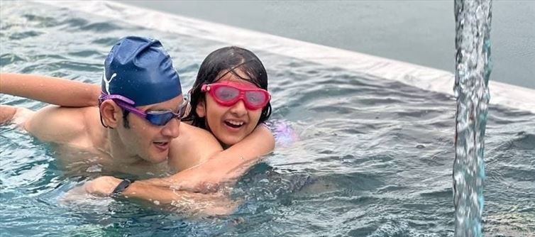 Mahesh Babu also posted an image of himself in the water with gautam and Sitara earlier. Sitara can be seen jumping atop the star while he looks at his son in the photo. He commented, "Sharing the image, "For the pleasure of hot springs and waters! I'm now at ease with these guys! #SwissDiaries."