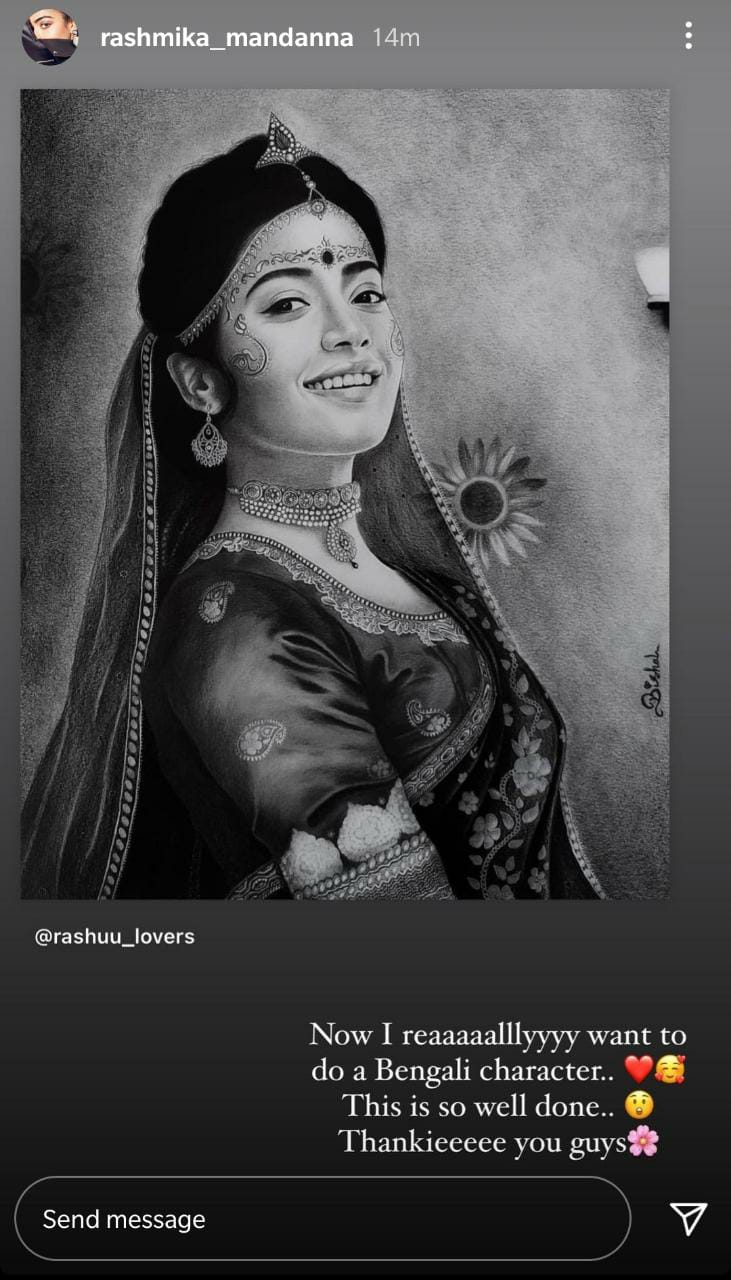 Rashmika Mandanna openly admitted her wish to play a bengali character by uploading a fan-made artwork of her dressed in a bengali outfit. rashmika shared a fan-made creation on her instagram post, in which she is seen dressed in bengali costume, and remarked, "I really, really want to portray a bengali character now. This is extremely well-done. Thank you, thank you!"
