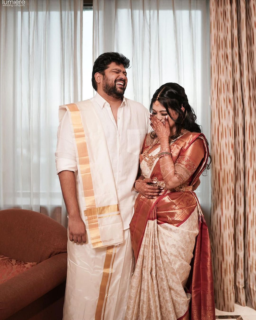 Mahathi and Sanjana wore traditional indian clothing in a lungi and saree in a few images. In the other photos, the couple is wearing a navy blue sherwani outfit and the bride-to-be is wearing a stunning lehenga. mahathi captioned the photo, " "I'M ENGAGED!!! IN THE NAME OF THIS beautiful SOUL... @sanjanakalmanje, I can't wait to spend the entire time with you."