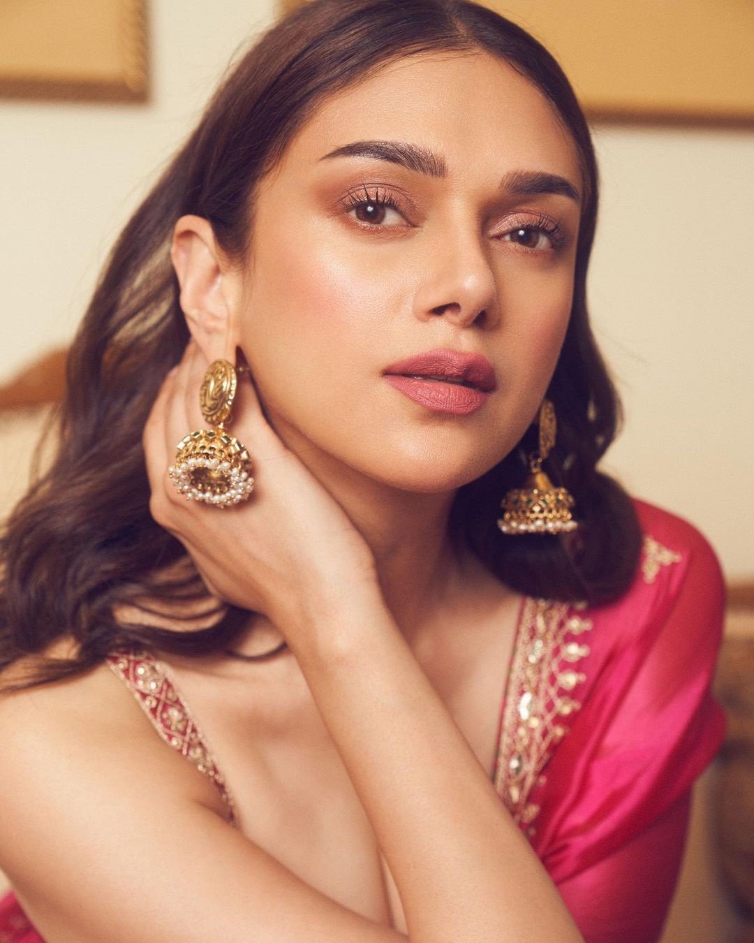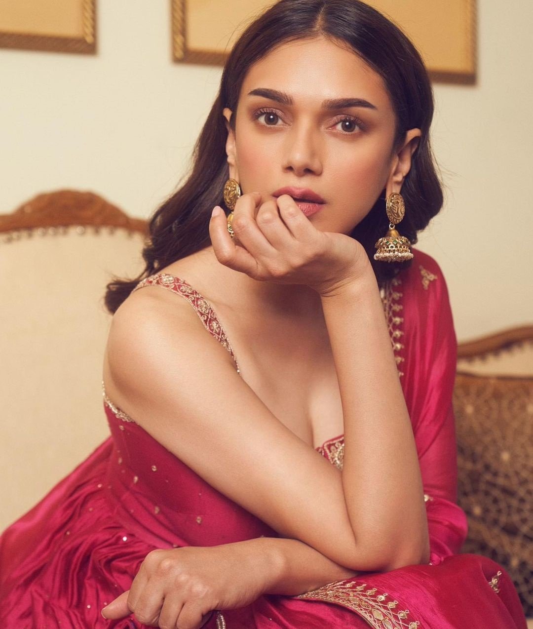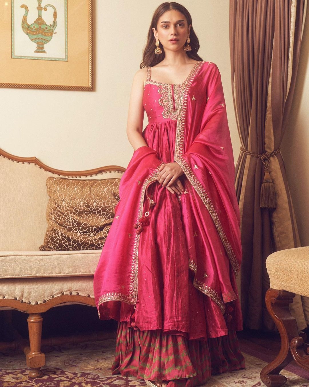 Aditi Rao Hydari is one of India's most brilliant and well-known actresses. She will soon be seen in the tollywood film maha Samudram, for which she is actively marketing with every post on her social media accounts, leaving us all in wonder. aditi rao hydari came to instagram to share a photo of herself wearing a sharara outfit and looking majestic. Aditi delivers huge fashion inspo for the christmas season, dressed in Punit Balana's rani pink sharara suit set.