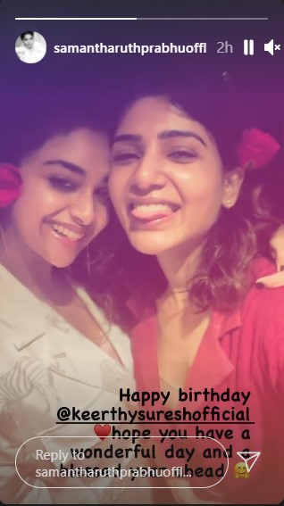 Samantha penned a birthday card and posted a boomerang video with Keerthy suresh from their previous club night. She penned, "@keerthysuresh, happy birthday! I wish you a nice day and a prosperous year ahead." Her upcoming film's producers have also issued special postcards to wish her well. Bhola Shankar, starring Chiranjeevi, debuted a birthday image, while Dasara, starring Nani, debuted a video from the film.