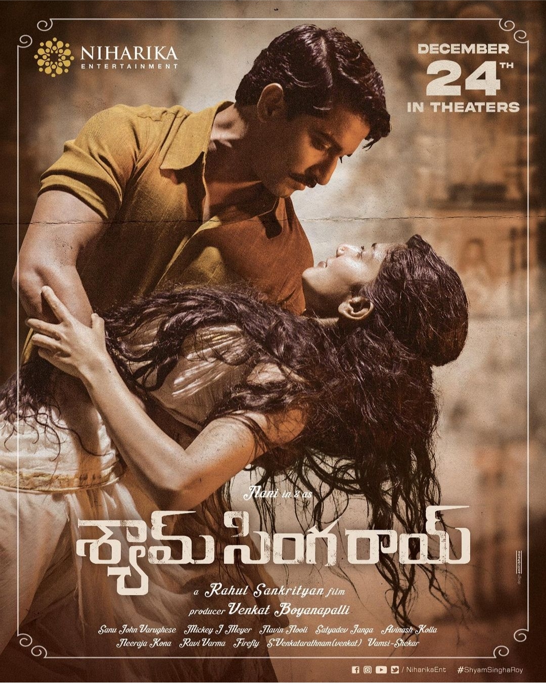 నాచురల్ స్టార్ నాని వరుస సినిమాలతో ఎంత బిజీగా ఉన్నాడో మన అందరికీ తెలిసిందే, ఇప్పటికే తాను నటించిన  వి, టక్ జగదీష్ సినిమాలను ఓటిటి లో విడుదల చేసిన  ఈ హీరో తన తదుపరి చిత్రం అయిన శ్యామ్ సింగరాయ్ ను థియేటర్ల లో విడుదల చేయబోతున్నట్లు తాజా గా కన్ఫర్మ్ చేశాడు. శ్యామ్ సింగ రాయ్ సినిమా కలకత్తా బ్యాక్ డ్రాప్ లో రూపొందుతున్న హై వోల్టేజ్ యాక్షన్ ఎంటర్టైనర్. ఎంతో ప్రతిష్టాత్మకంగా తెరకెక్కుతున్న ఈ సినిమాలో పల్లవి - కృతి శెట్టి - మడోన్నా సెబాస్టియన్ హీరోయిన్లుగా నటిస్తున్నారు. ఇప్పటికే దాదాపు షూటింగ్ మొత్తం పూర్తి చేసుకున్న ఈ సినిమా ప్రస్తుతం పోస్ట్ ప్రొడక్షన్ పనులు జరుగుతున్నట్టు తెలుస్తోంది. ఇది ఇలా ఉంటే ఈ సినిమాకు సంబంధించిన ఆసక్తికరమైన అప్డేట్ ను చిత్రబృందం తాజా గా విడుదల చేసింది. శ్యామ్ సింగ రాయ్'' సినిమాను క్రిస్మస్ కానుకగా డిసెంబర్ 24 న ప్రపంచ వ్యాప్తంగా రిలీజ్ చేస్తున్నట్లు హీరో నాని ప్రకటించారు.