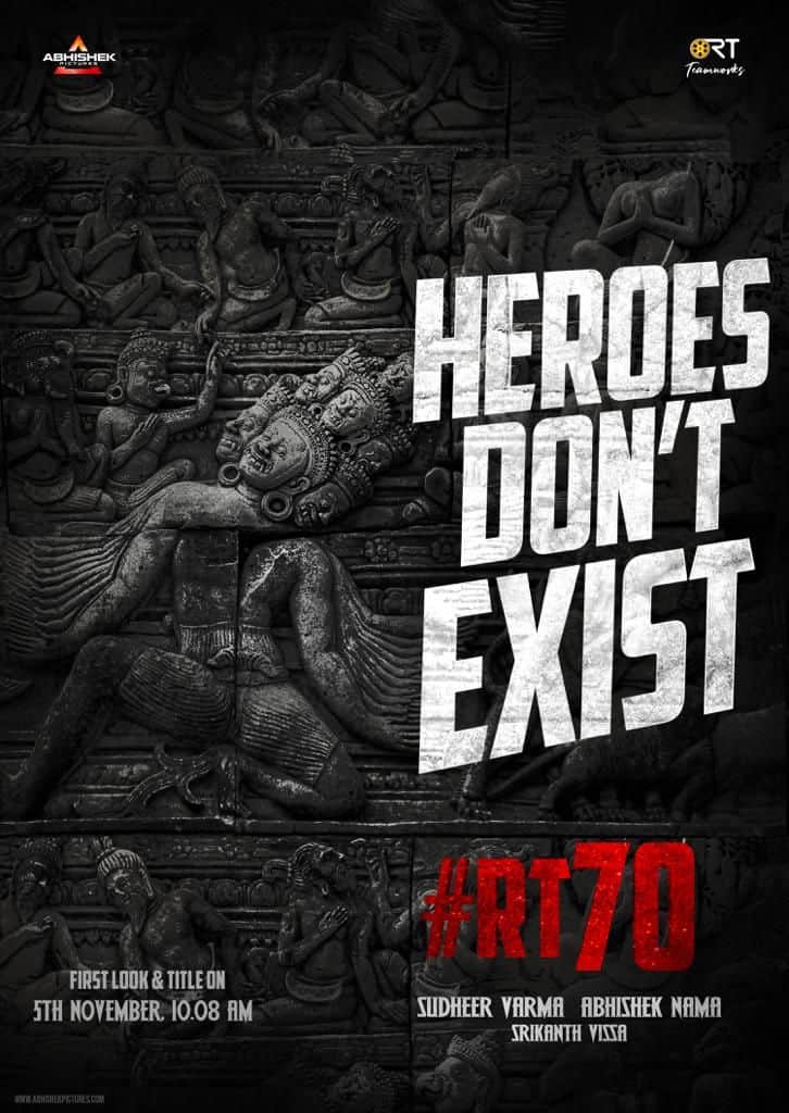 Being so, the latest buzz in tollywood circle is that he has signed one more movie. The tentatively 'RT70' movie will be directed by Sudheer Verma. It has been announced that the movie first look will be released on november 5th. A poster was released for the same. The poster was splendid with sculptures in the background and a text “Heroes don’t exist” being the focus on the poster. This has spooked interest about the movie in tollywood circles.