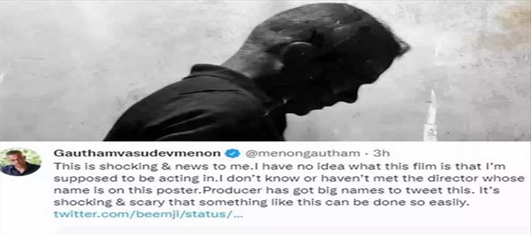 గౌతమ్ మీనన్ మాట్లాడుతూ ..ఈ సినిమాలో నేను నటించలేదు అంటూ షాకింగ్ కామెంట్ చేశాడు. ఈ పోస్టర్ లో కనిపిస్తున్న డైరెక్టర్ పేరు కూడా నాకు తెలియదు అంటూ చెప్పుకొచ్చాడు. అతని నేనెన్నడూ చూడలేదు కలవలేదని కూడా తన ట్విట్టర్ ద్వారా తెలియజేశాడు. ఈ విషయం తెలుసుకున్న ప్రతి ఒక్కరూ ఒక్కసారిగా షాక్కు గురయ్యారు.